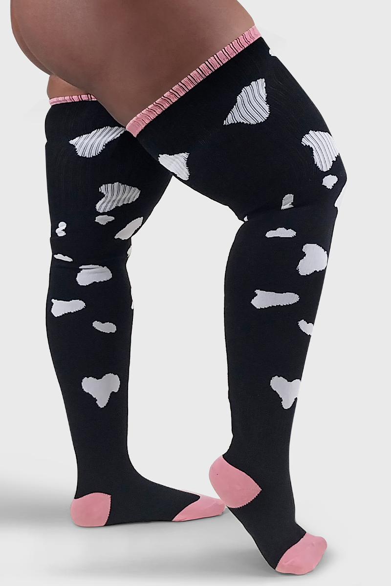 A pair of thigh-high socks with a cow print pattern, predominantly black with white spots, and pink at the cuffs.