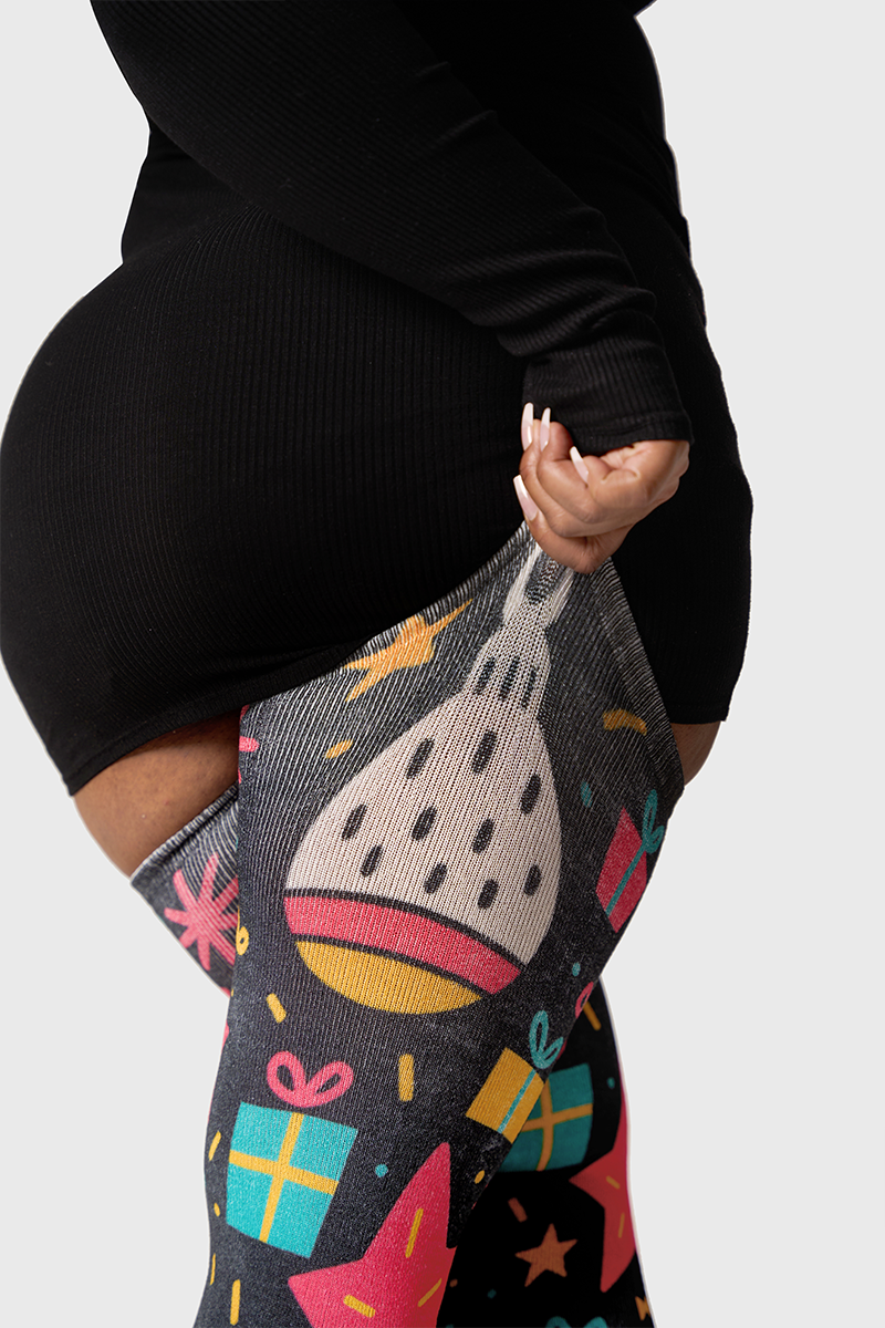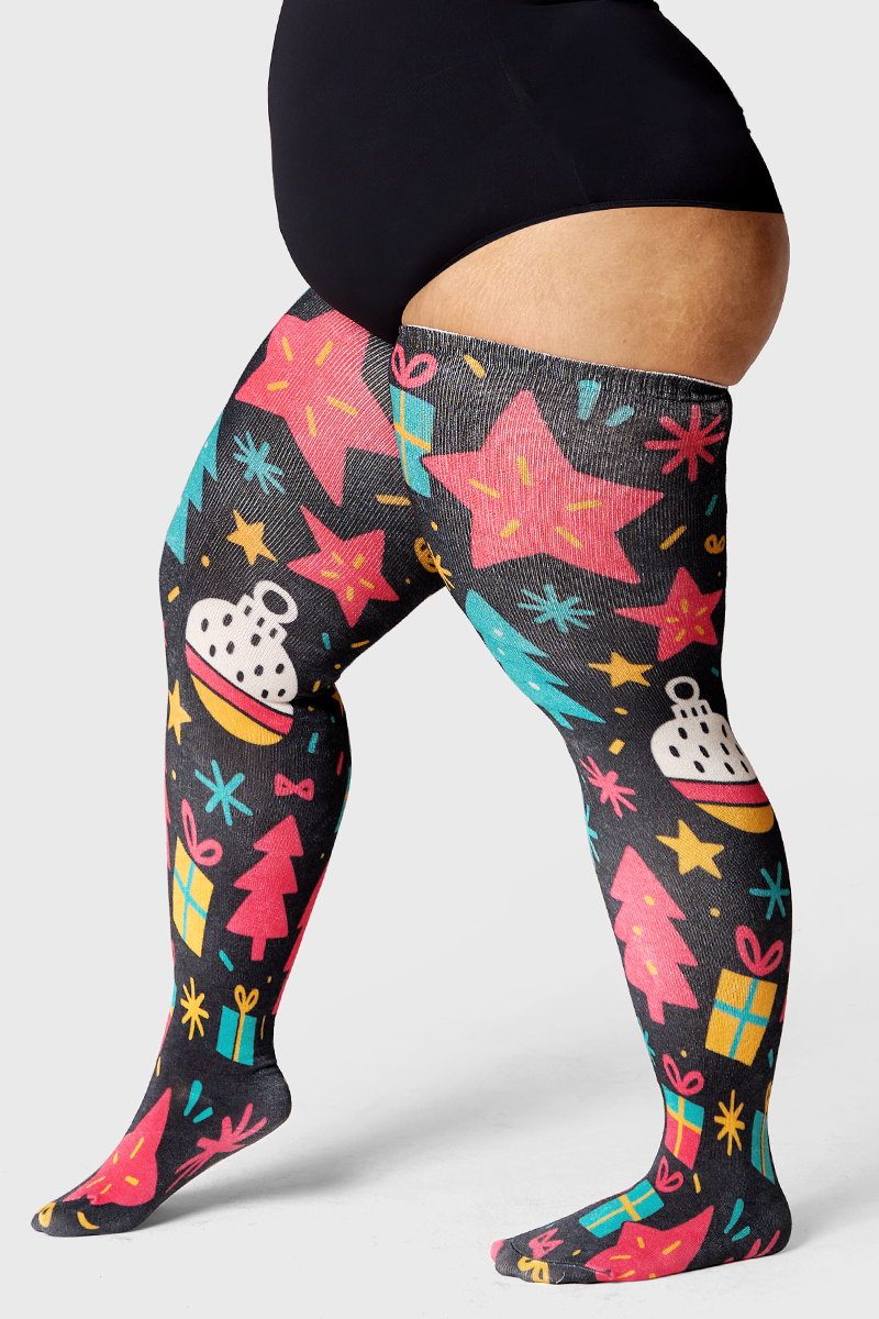 Bright, bold and full of festive cheer, 'Tis the Season is the ultimate holiday statement sock. Colorful trees, stars, ornaments and presents pop against a dark background for a fun and playful look that brings instant joy to any outfit. Made with our lightweight Artisan fabric and signature wide stretch, these thigh-highs fit comfortably and hold their shape while keeping your holiday spirit loud and clear. Limited quantities available, so grab a pair before the celebrations begin.