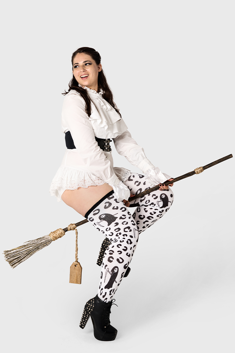 Feral meets fatal. Wild Reaper layers black grim reapers over a monochrome leopard print for a fierce, fashion horror mashup. With our curve loving stretch and comfort, this pair brings runway energy to your Halloween lineup.