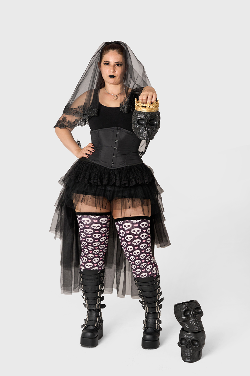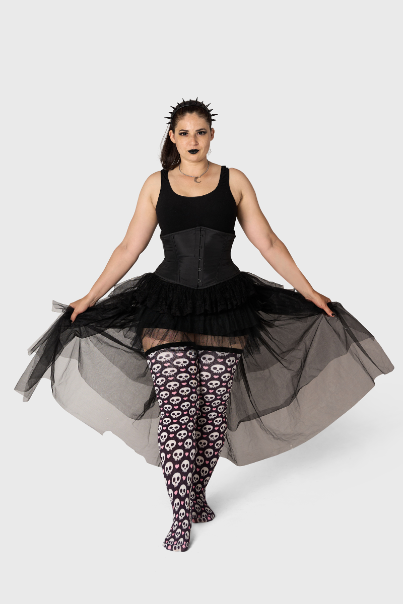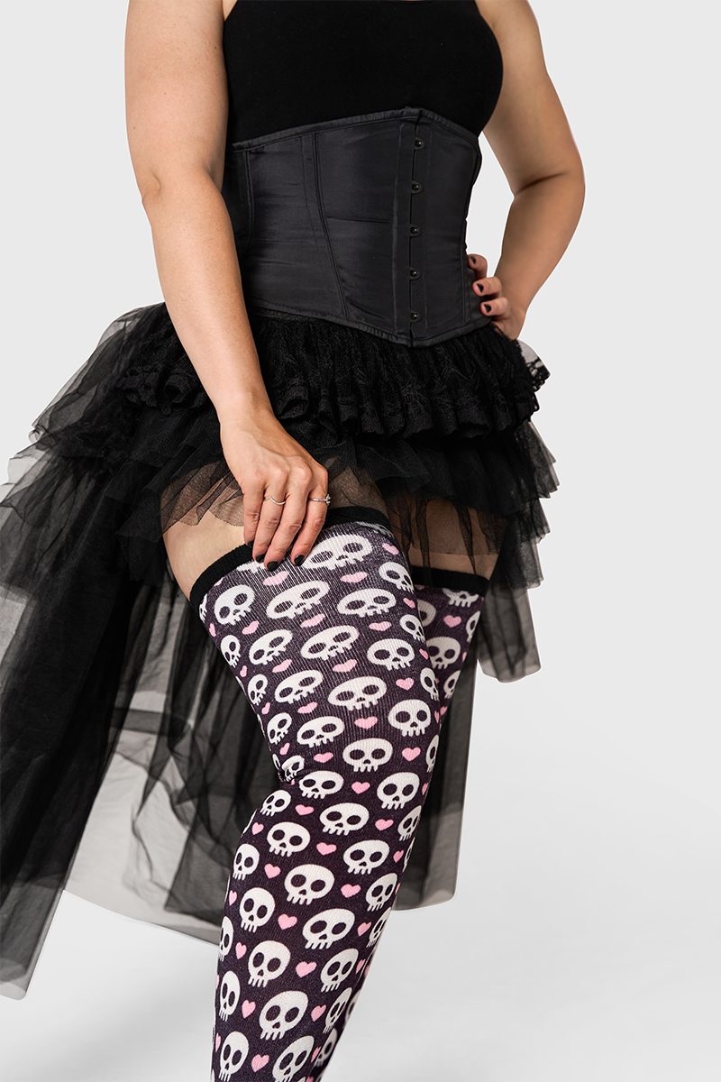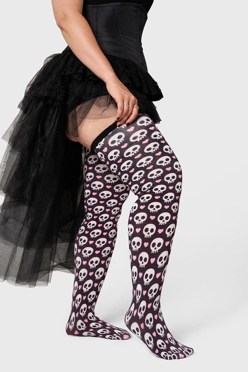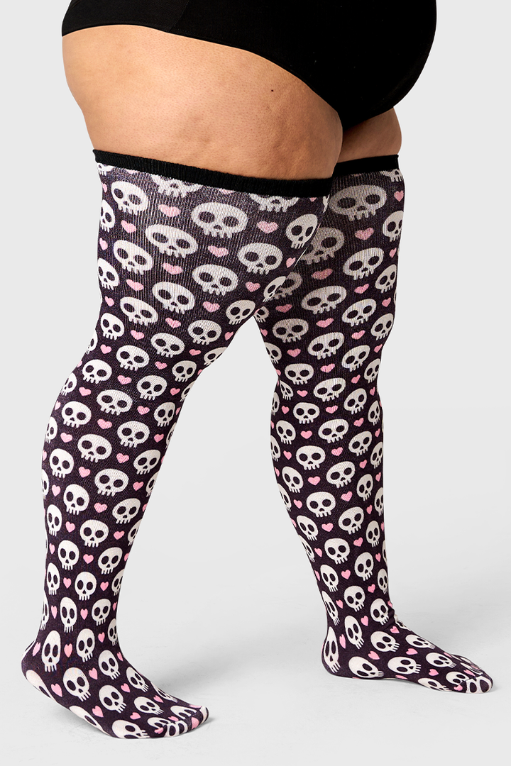 Dark romance, delivered. White skulls and pink hearts pop against a deep black base for a moody, flirty statement sock. The Artisan fabric keeps things lightweight and breathable while stretching up to 42" to fit and flatter. Limited edition for Halloween claim yours before it disappears.