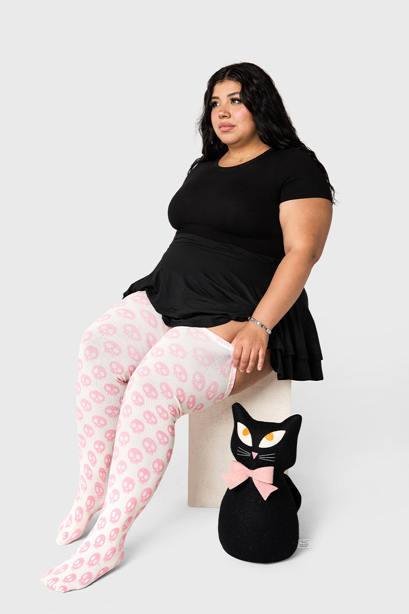 Clean, cute, and a little deadly. Skully repeats soft pink skulls across a creamy white thigh-high for a softer take on spooky season. Built in our Artisan Collection’s airy, stretchy fabric, it hugs curves comfortably (up to 52"). Limited edition: once it’s gone, it’s ghost.