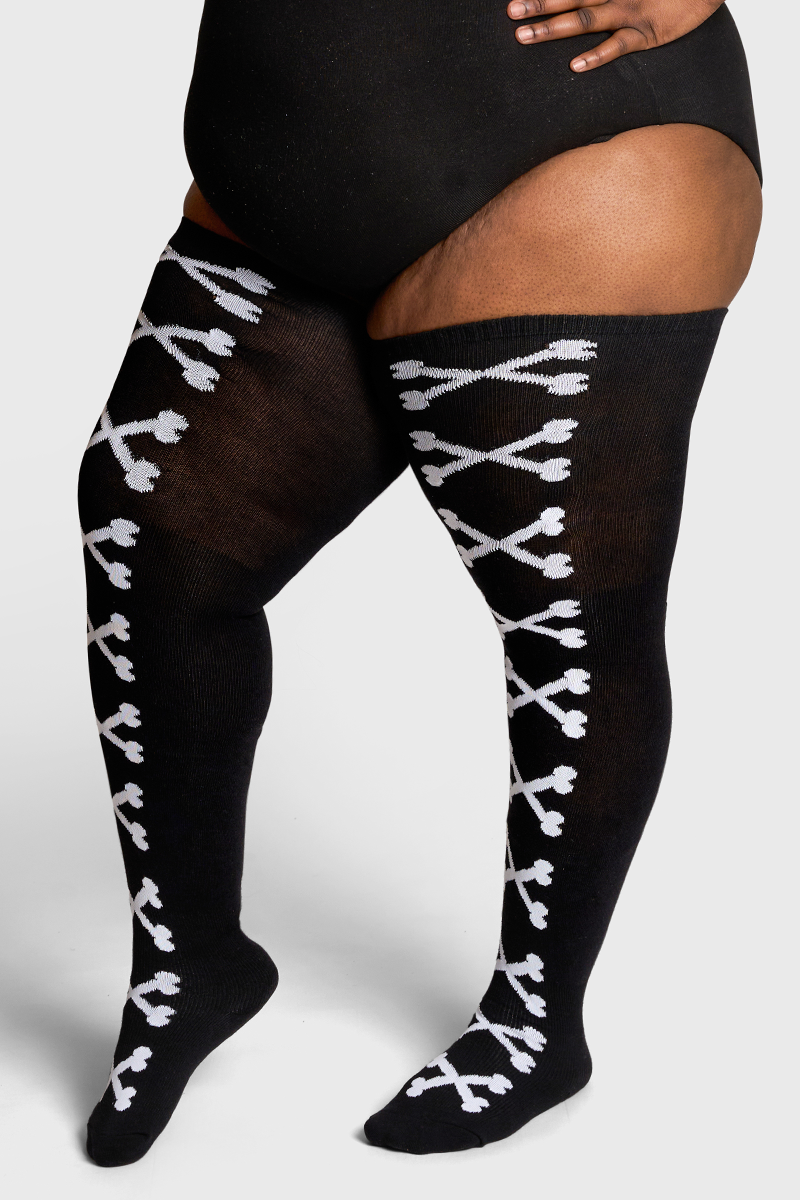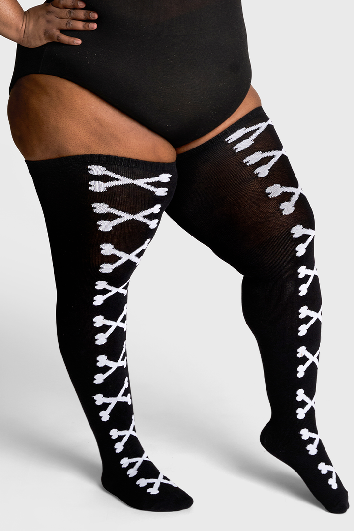 Make no bones about it Crossbones is a head turner. This black Thunda Tubbies thigh high features a bold crossbones running down the front in your choice of crisp white or punchy pink. Made from our breathable cotton blend with the signature Thunda stretch (up to 42"), it hugs thighs comfortably while serving spooky punk attitude from day to night. Limited Halloween drop. Snag a pair before it vanishes.